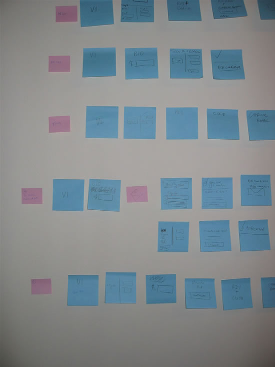 - Sticky notes were used to brainstorm potential page-by-page flows as well as analyze the existing flow.
